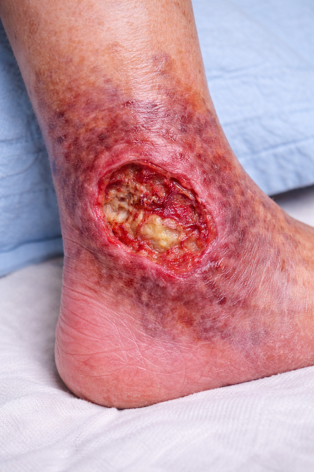 A Venous Ulcer is an open wound that develops due to poor blood flow in the veins, a condition known as chronic venous insufficiency (CVI). When veins fail to return blood efficiently to the heart, pressure builds up in the lower legs. Over time, this pressure damages the skin and underlying tissue, leading to ulcer formation.
